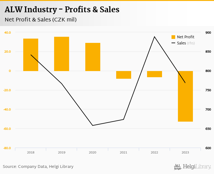 ALW Industry made a net profit of CZK -52.6 mil in 2023, down 721% compared to the previous year. Total sales reached CZK 768 mil, which is down 13.5% when compared to the previous year.