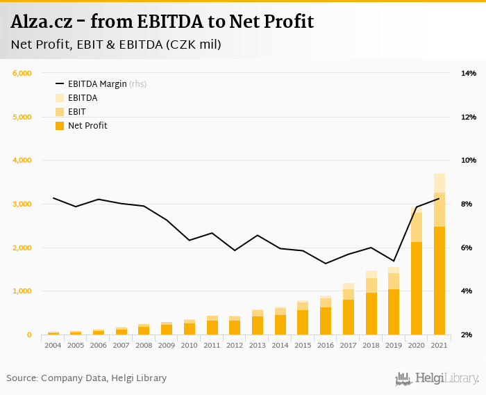 Alza.cz made a net profit of CZK 2,497 mil with revenues of CZK 44,995 mil in 2021, up by 16.7% and up by 20.3%, respectively, compared to the previous year. This translates into a net margin of 5.55%.