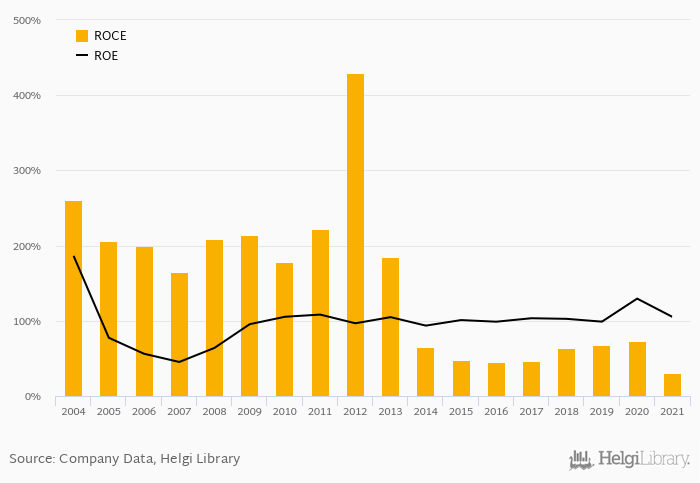 The result implies a return on equity of 105% and a return on invested capital of 31.1% in 2021. That is compared to an average of 108% and 56.5% over the last five years.