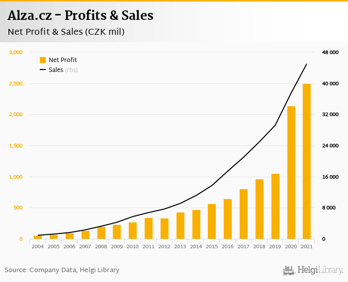 Alza.cz made a net profit of CZK 2,497 mil in 2021, up 16.7% compared to the previous year. Total sales reached CZK 44,995 mil, which is up 20.3% when compared to the previous year.