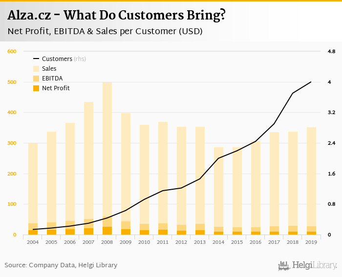 In 2019, Alza.cz served a total of 4.00 mil customers, up 64.0% when compared to 3 years ago. A simple comparison of Alza.cz's sales with a number of its customers reveals that the average customer brought the firm USD 323 revenue in 2019. In terms of profitability, a single client generated EBITDA of USD 17.4 and a net profit of USD 11.7 in 2019.