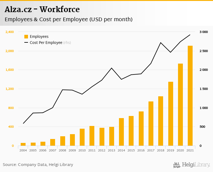 Alza.cz employed 2,112 employees in 2021, up 21.7% compared to the previous year. Historically, between 2002 and 2021, the firm's workforce hit a high of 2,112 employees in 2021 and a low of 15.0 employees in 2002.