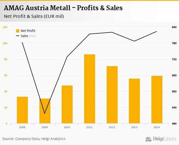 AMAG Austria Metall made a net profit of EUR 59.2 mil in 2014, up 5.68% compared to the previous year. Total sales reached EUR 823 mil, which is up 4.64% when compared to the previous year.