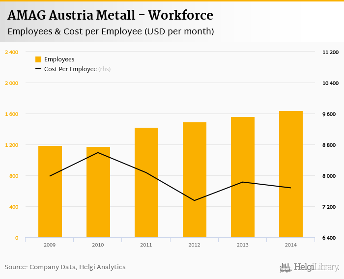 AMAG Austria Metall employed 1,638 employees in 2014, up 4.73% compared to the previous year. Historically, between 2009 and 2014, the firm's workforce hit a high of 1,638 employees in 2014 and a low of 1,175 employees in 2010.