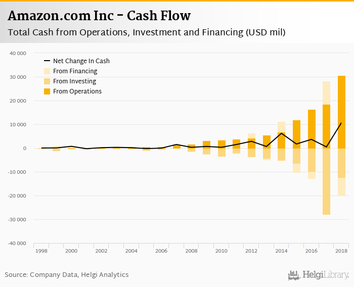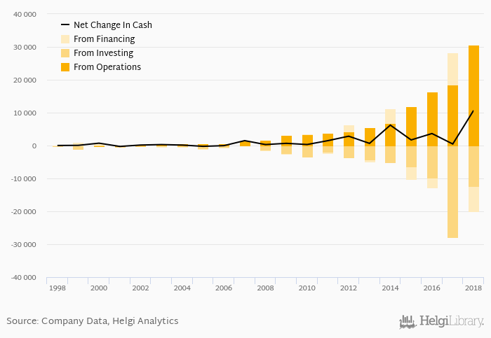 Amazon.com Inc's operating cash flow stood at USD 30,723 mil in 2018, up 66.7% when compared to the previous year. Historically, between 1998 - 2018, the firm’s operating cash flow reached a high of USD 30,723 mil in 2018 and a low of USD -130 mil in 2000.