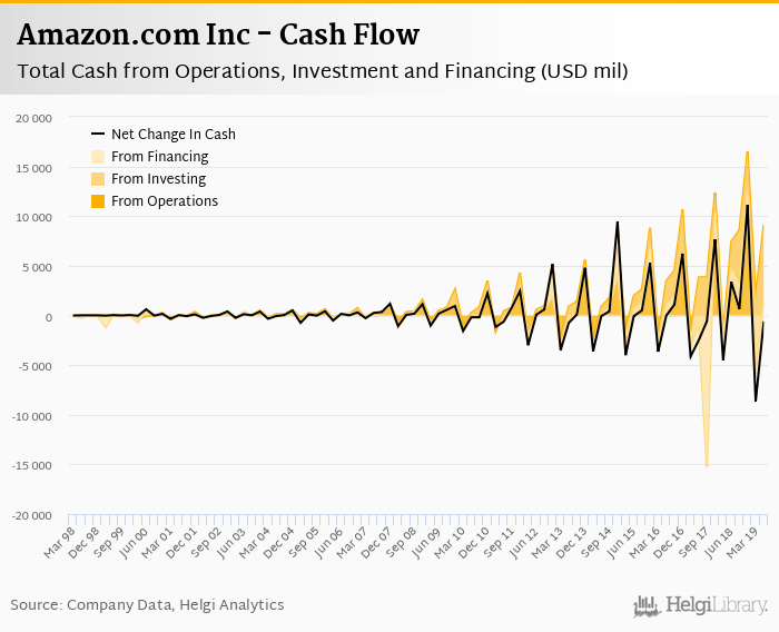 At the end of 2Q2019, the company had a net debt of USD 713 mil, or 0.021x of EBITDA and 1.34 of equity. Net working capital amounted to USD -736 mil, or -1.16% of sales. The cash conversion cycle stood at -10.4 days in 2Q2019. This is an improvement compared to the previous year (-99.4 days), so Amazon.com Inc’s working capital was tied up for 89.0 fewer days.