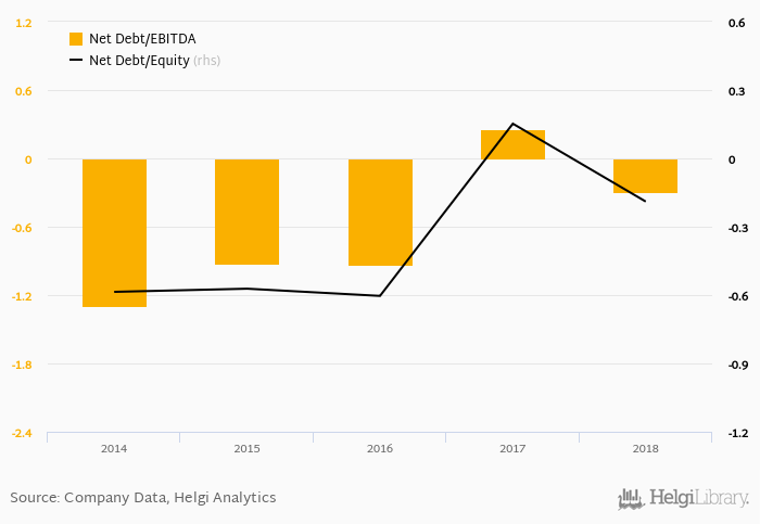 Net debt to EBITDA was calculated at -0.295x at the end of the year. That is down from x seen in 2013. The ratio reached a high of 0.262x in 2017 and a low of -1.30x in 2014.