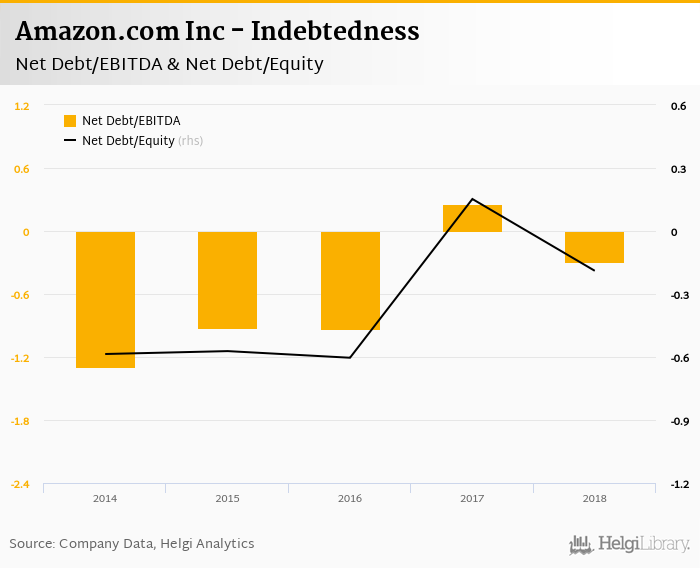 Amazon.com Inc's net debt stood at USD -8,255 mil and accounted for -0.190 of equity at the end of 2018. The ratio is down 0.342 pp compared to the previous year.