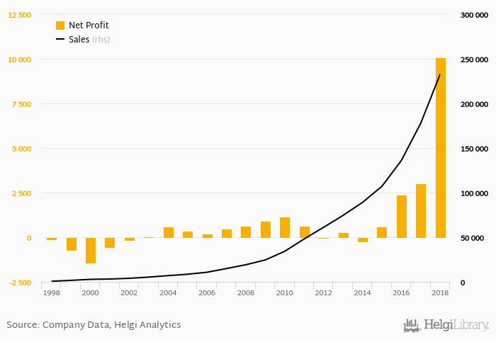 Historically, between 1998 and 2018, the company’s net profit reached a high of USD 10,073 mil in 2018 and a low of USD -1,411 mil in 2000. Over the last decade the firm's net profit increased by an average of 31.6% a year.