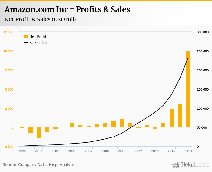Amazon.com Inc made a net profit of USD 10,073 mil in 2018, up 232% compared to the previous year. Total sales reached USD 232,887 mil, which is up 30.9% when compared to the previous year.