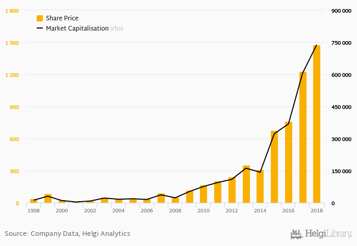 Since the end of 2013, stock has appreciated by 321% implying an annual average growth of 33.3% In absolute terms, the value of the company rose by USD 577,771 mil.