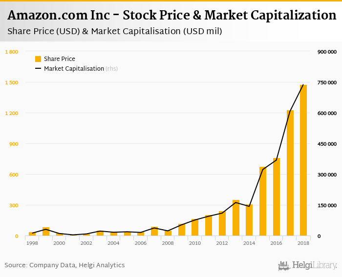 Amazon.com Inc stock traded at USD 1,478 per share at the end 2018 implying a market capitalization of USD 739,000 mil.