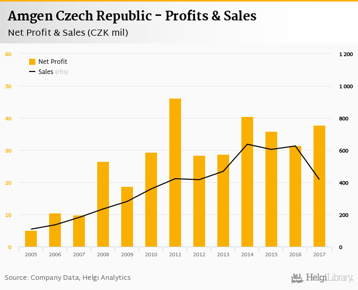 Amgen Czech Republic made a net profit of CZK 37.8 mil in 2017, up 20% compared to the previous year. Total sales reached CZK 417 mil, which is down 33.4% when compared to the previous year.