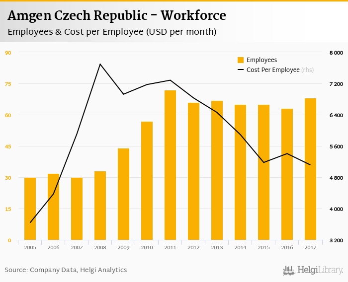 Amgen Czech Republic employed 68.0 employees in 2017, up 7.94% compared to the previous year. Historically, between 2004 and 2017, the firm's workforce hit a high of 72.0 employees in 2011 and a low of 25.0 employees in 2004.