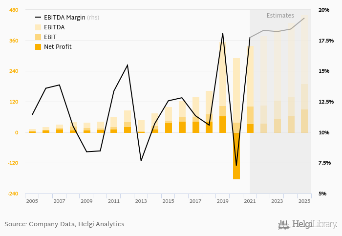 Historically, between 2005 - 2021, the firm’s net profit reached a high of EUR 65.1 mil in 2019 and a low of EUR -182 mil in 2020. Since 2016, the firm's net profit has decreased 24.7% or -5.51% a year on average.
