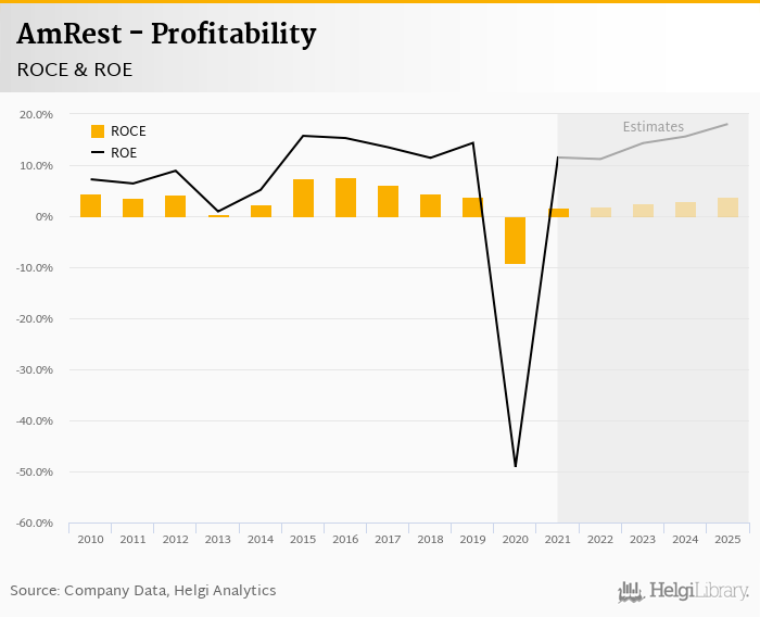 AmRest made a net profit of EUR 32.9 mil in 2021, up 118% compared to the previous year. Historically, between 2005 and 2021, the company's net profit reached a high of EUR 65.1 mil in 2019 and a low of EUR -182 mil in 2020.