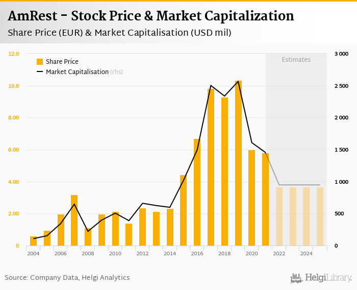 AmRest stock traded at EUR 5.82 per share at the end 2021 implying a market capitalization of USD 1,455 mil.