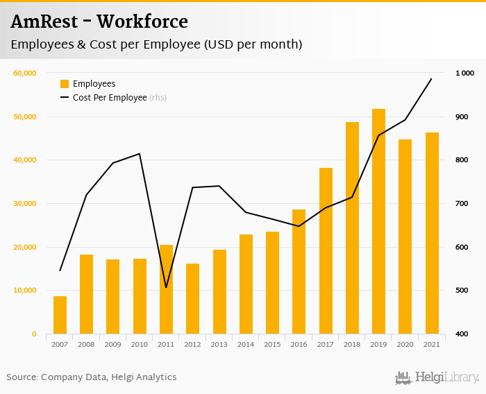 AmRest employed 46,480 employees in 2021, up 3.8% compared to the previous year. Historically, between 2007 and 2021, the firm's workforce hit a high of 51,804 employees in 2019 and a low of 8,796 employees in 2007.
