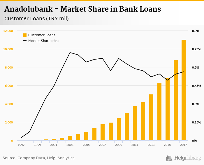 Anadolubank accounted for 0.562% of all customer loans issued in Turkey at the end of 2017. Historically, the bank’s market share in customer loans reached an all time high of 0.719% in 2003 and an all time low of 0.023% in 1997.