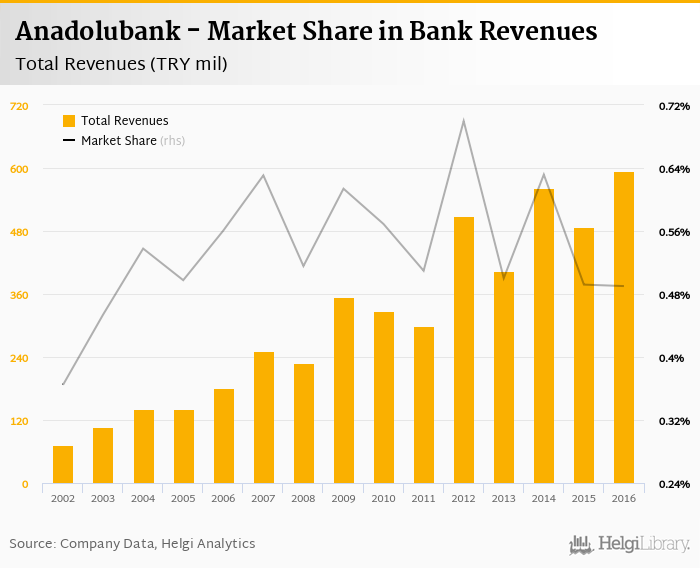 As a result, Anadolubank accounted for 0.490% of all bank revenues generated by banks in Turkey in 2016. Historically, the bank’s market share in total revenues reached an all time high of 0.700% in 2012 and an all time low of 0.365% in 2002.