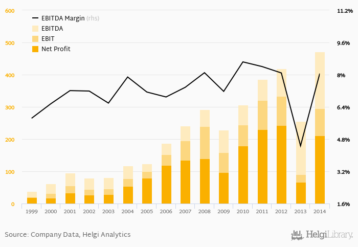 Historically, between 1999 - 2014, the firm’s net profit reached a high of EUR 244 mil in 2012 and a low of EUR 17.8 mil in 2000. Since 2009, the firm's net profit has increased 118% or 16.8% a year on average.