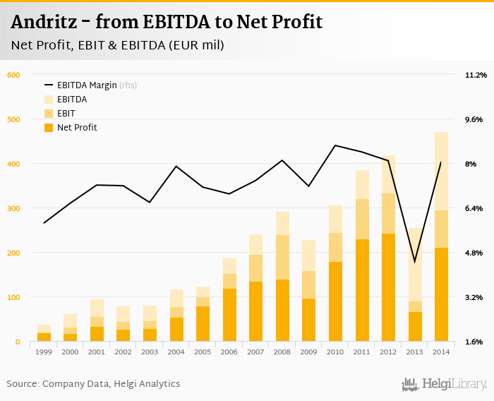 Andritz made a net profit of EUR 211 mil with revenues of EUR 5,859 mil in 2014, up by 217% and up by 2.6%, respectively, compared to the previous year. This translates into a net margin of 3.60%.