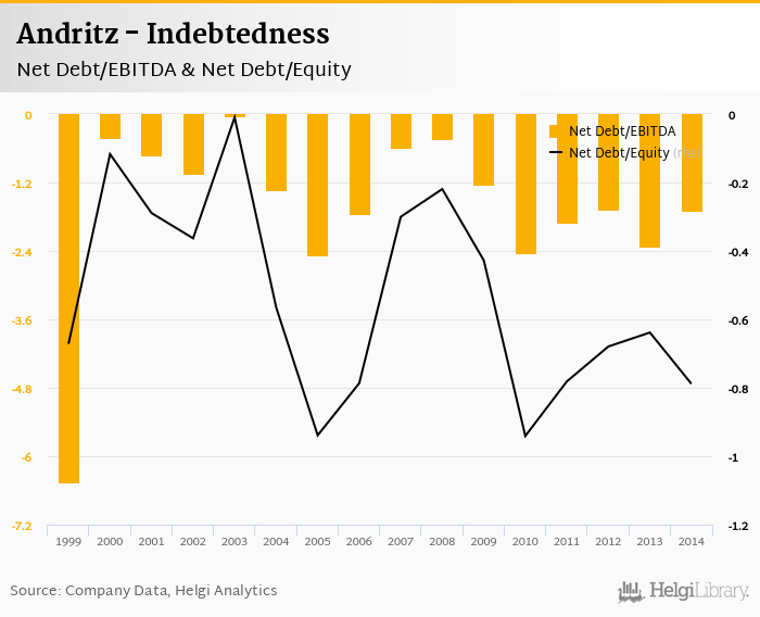 Andritz's net debt stood at EUR -800 mil and accounted for -0.789 of equity at the end of 2014. The ratio is down 0.150 pp compared to the previous year.
