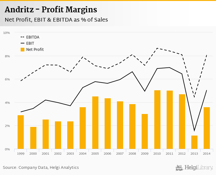 Andritz made a net profit of EUR 211 mil with revenues of EUR 5,859 mil in 2014, up by 217% and up by 2.6%, respectively, compared to the previous year.