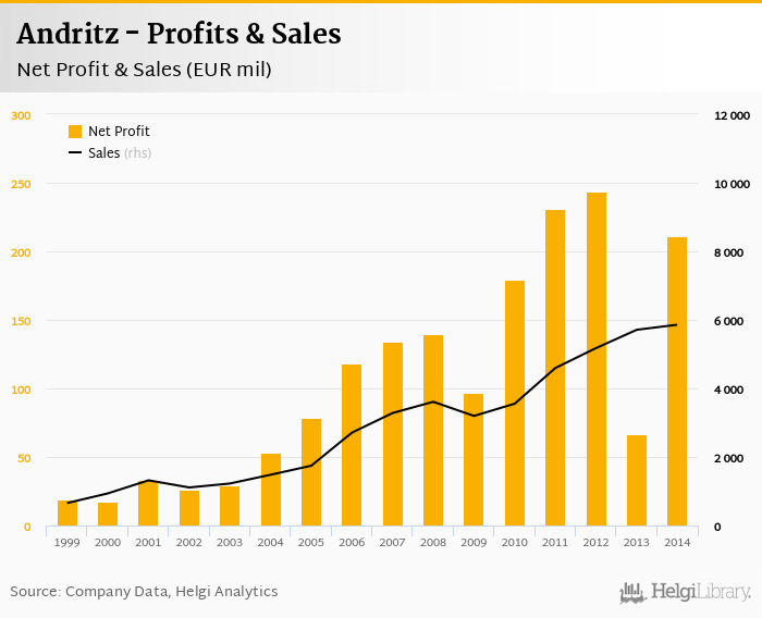 Andritz made a net profit of EUR 211 mil in 2014, up 217% compared to the previous year. Total sales reached EUR 5,859 mil, which is up 2.6% when compared to the previous year.