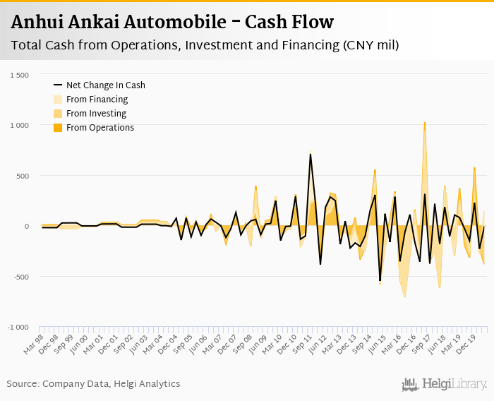 Anhui Ankai Automobile's operating cash flow stood at CNY -387 mil in 2Q2020, down 95.4% when compared to the previous year. Historically, between 1Q1996 - 2Q2020, the firm’s operating cash flow reached a high of CNY 1,024 mil in 2Q2017 and a low of CNY -689 mil in 2Q2016.