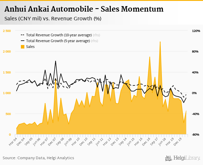 Anhui Ankai Automobile generated sales of CNY 571 mil in 2Q2020, down 33.4% compared to the previous year. Historically, between 1Q1994 and 2Q2020, the company’s sales reached a high of CNY 2,232 mil in 4Q2017 and a low of CNY 32.0 mil in 1Q1994.