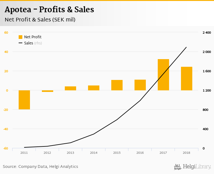 Apotea made a net profit of SEK 24.4 mil in 2018, down 24.4% compared to the previous year. Total sales reached SEK 2,092 mil, which is up 36.3% when compared to the previous year.