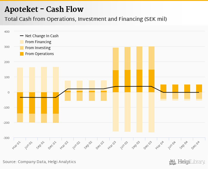 Apoteket's operating cash flow stood at SEK 51.8 mil in 4Q2004, down 65.2% when compared to the previous year. Historically, between 1Q2001 - 4Q2004, the firm’s operating cash flow reached a high of SEK 149 mil in 4Q2003 and a low of SEK -142 mil in 3Q2001.