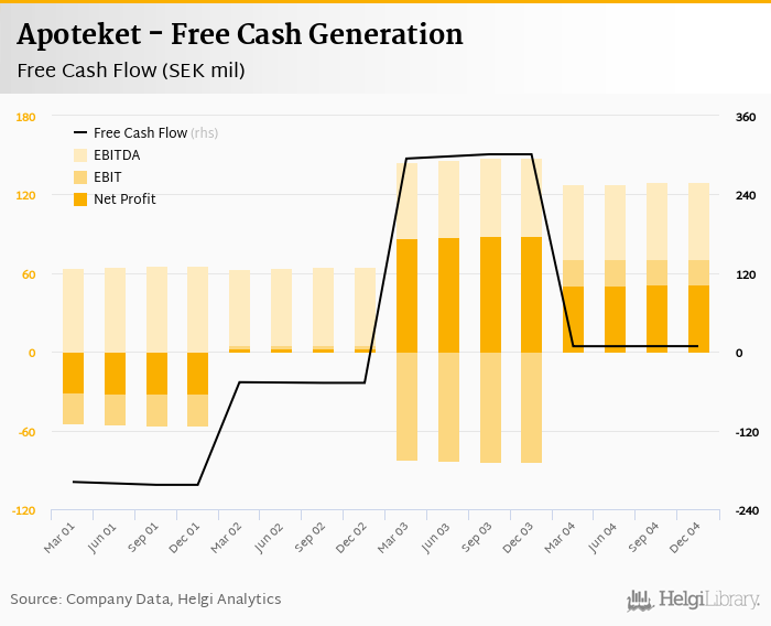 Apoteket made a net profit of SEK 51.3 mil with revenues of SEK 8,570 mil in 4Q2004, down by 42% and up by 2.68%, respectively, compared to the previous year. This translates into a net margin of 0.598%.