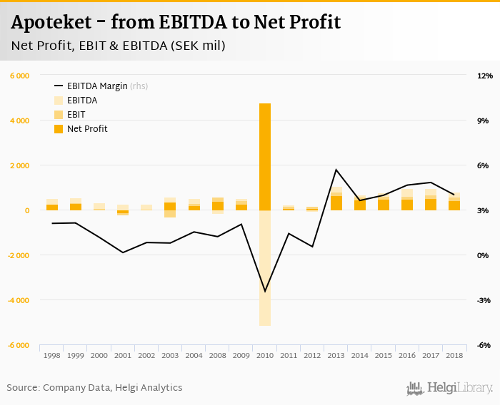 Apoteket made a net profit of SEK 426 mil with revenues of SEK 20,092 mil in 2018, down by 15.3% and up by 1.07%, respectively, compared to the previous year. This translates into a net margin of 2.12%.
