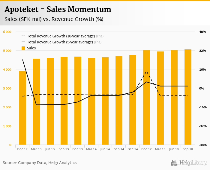 Apoteket generated sales of SEK 5,064 mil in 3Q2018, up 1.07% compared to the previous year. Historically, between 1Q2001 and 3Q2018, the company’s sales reached a high of SEK 9,951 mil in 3Q2008 and a low of SEK 1,323 mil in 4Q2007.