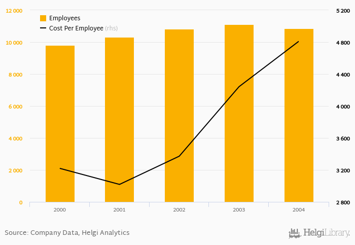 Staff cost represented 13.5% of sales in 2004, 13.5 pp higher than a decade ago.