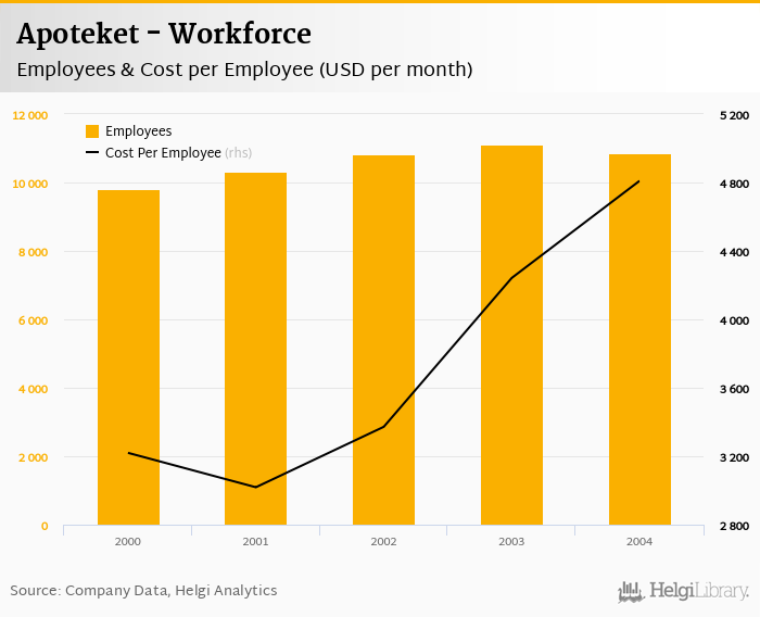 Apoteket employed 10,856 employees in 2004, down 2.41% compared to the previous year. Historically, between 2000 and 2004, the firm's workforce hit a high of 11,124 employees in 2003 and a low of 9,802 employees in 2000.