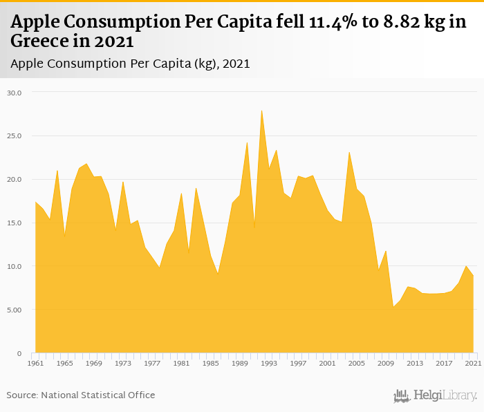 Apple consumption per capita fell 11.4% to 8.82 kg in Greece in 2021, according to Faostat.