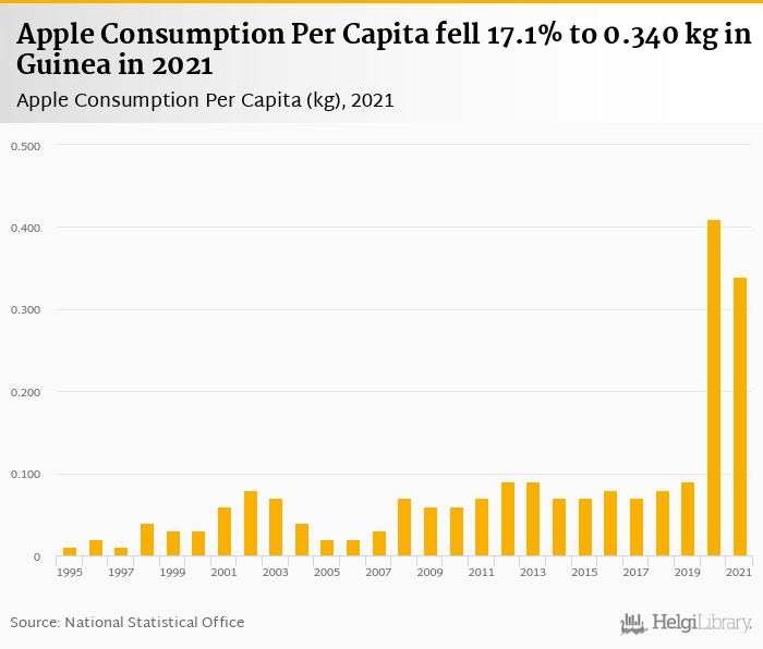 Apple consumption per capita fell 17.1% to 0.340 kg in Guinea in 2021, according to Faostat.