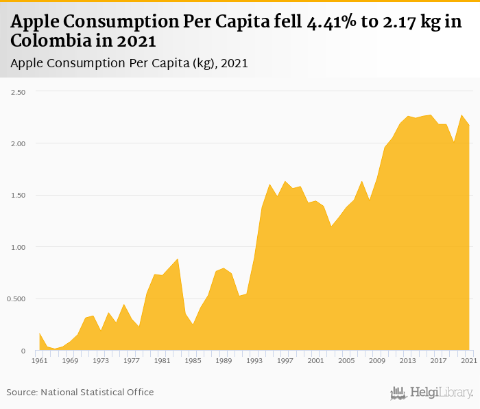 Apple consumption per capita fell 4.41% to 2.17 kg in Colombia in 2021, according to Faostat.
