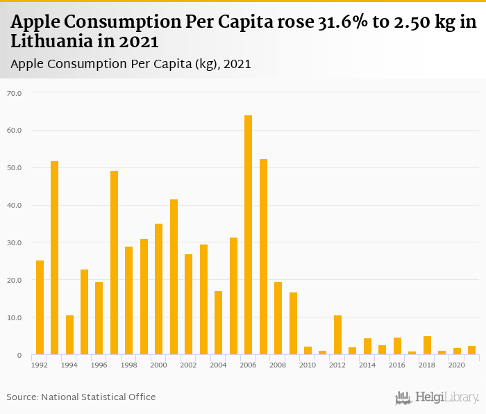 Apple consumption per capita rose 31.6% to 2.50 kg in Lithuania in 2021, according to Faostat.