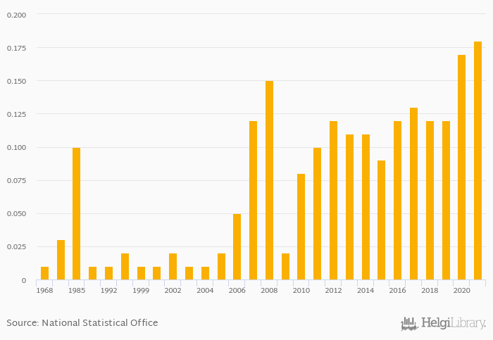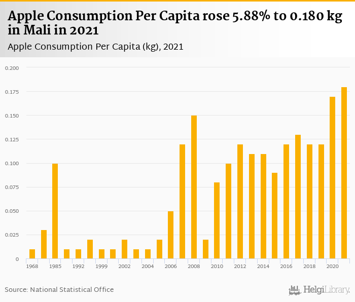 Apple consumption per capita rose 5.88% to 0.180 kg in Mali in 2021, according to Faostat.