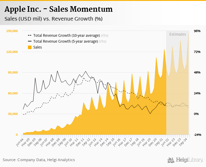 Apple Inc. generated sales of USD 95,422 mil in 1Q2022, up 8.14% compared to the previous year. Historically, between 2Q1994 and 1Q2022, the company’s sales reached a high of USD 123,549 mil in 4Q2021 and a low of USD 1,007 mil in 4Q2000.
