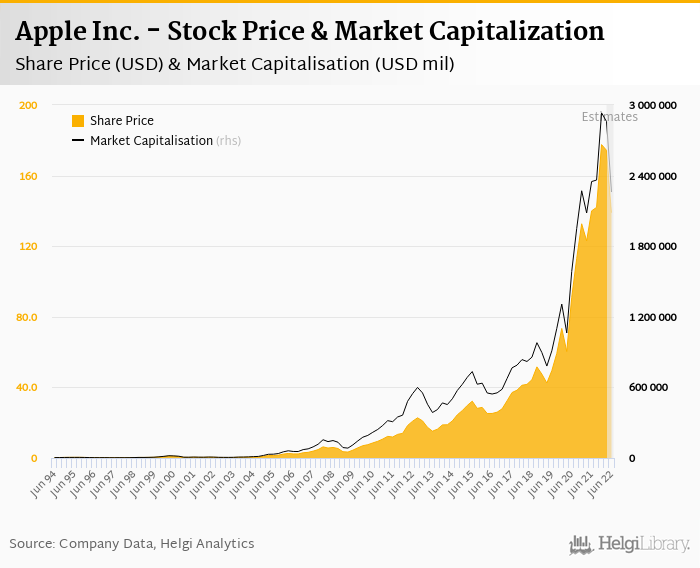 Historically, between 2Q1994 and 1Q2022, the Apple Inc.’s stock price reached a high of USD 178 in 4Q2021 and a low of USD 0.153 in 2Q1997.
