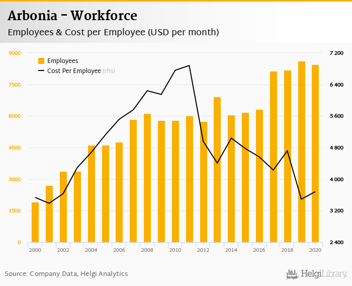 Arbonia employed 8,445 employees in 2020, down 1.87% compared to the previous year. Historically, between 2000 and 2020, the firm's workforce hit a high of 8,606 employees in 2019 and a low of 1,913 employees in 2000.