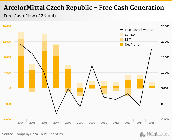 ArcelorMittal Czech Republic made a net profit of CZK 536 mil with revenues of CZK 34,916 mil in 2015, down by 78.2% and down by 10.8%, respectively, compared to the previous year. This translates into a net margin of 1.53%.