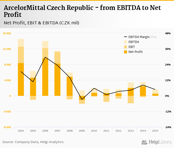 ArcelorMittal Czech Republic made a net profit of CZK 536 mil with revenues of CZK 34,916 mil in 2015, down by 78.2% and down by 10.8%, respectively, compared to the previous year. This translates into a net margin of 1.53%.