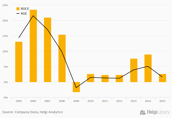 The result implies a return on equity of 1.55% and a return on invested capital of 2.61% in 2015. That is compared to an average of 2.58% and 4.76% over the last five years.