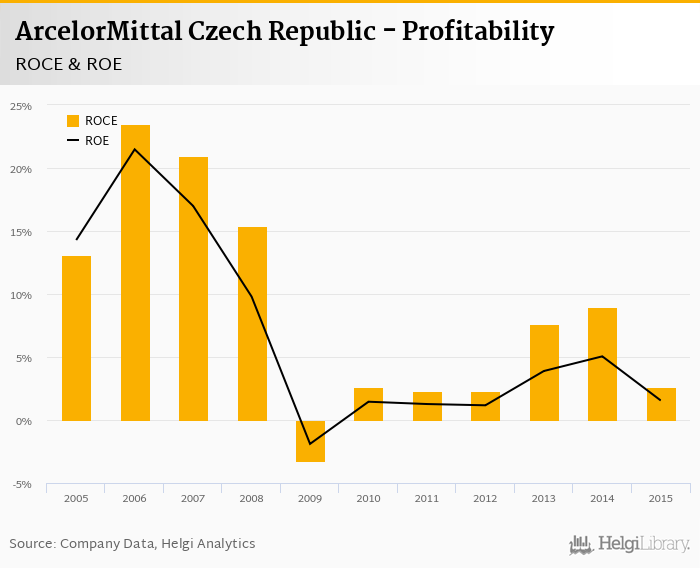 ArcelorMittal Czech Republic made a net profit of CZK 536 mil in 2015, down 78.2% compared to the previous year. Historically, between 2004 and 2015, the company's net profit reached a high of CZK 9,607 mil in 2006 and a low of CZK -993 mil in 2009.